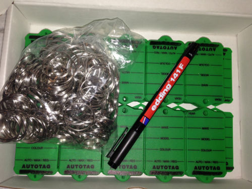 All boxes include 200 original and genuine Autotag key tags packed in a desk-top box, 1 black waterproof marker and 200 steel rings per box of key